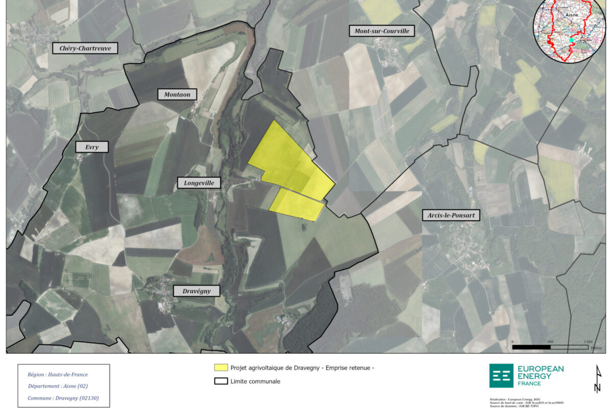 Dravegny est une commune rurale située dans le département de l’Aisne. Le projet agrivoltaïque est situé au nord-est de cette commune.